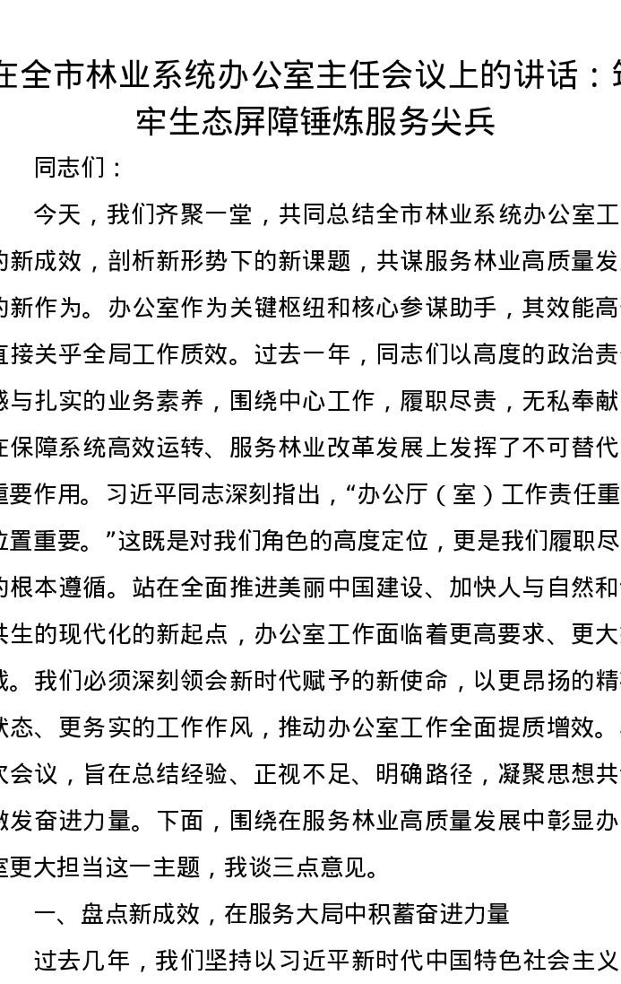 在全市林业系统办公室主任会议上的讲话:筑牢生态屏障 锤炼服务尖兵