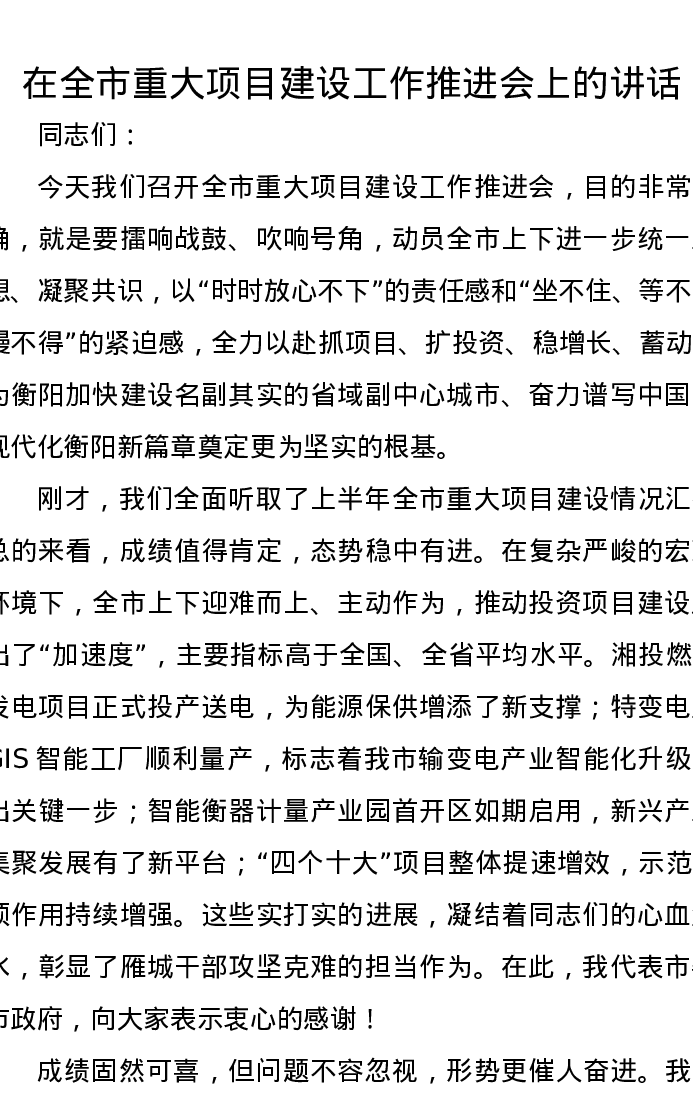 在全市重大项目建设工作推进会上的讲话