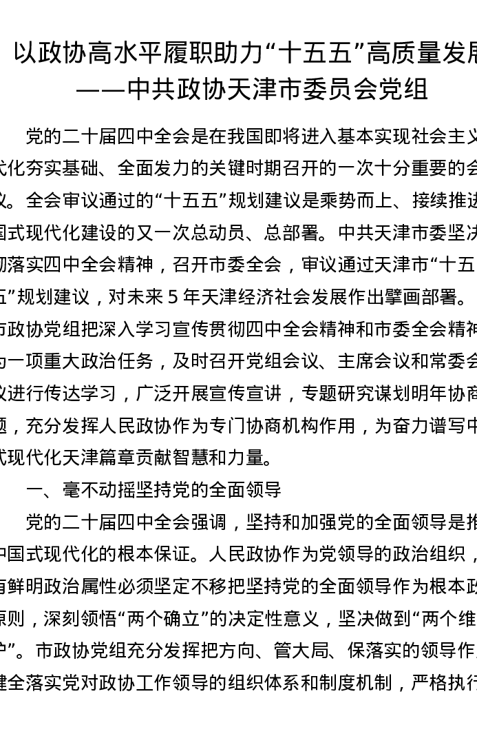 以政协高水平履职助力十五五高质量发展——中共政协天津市委员会党组