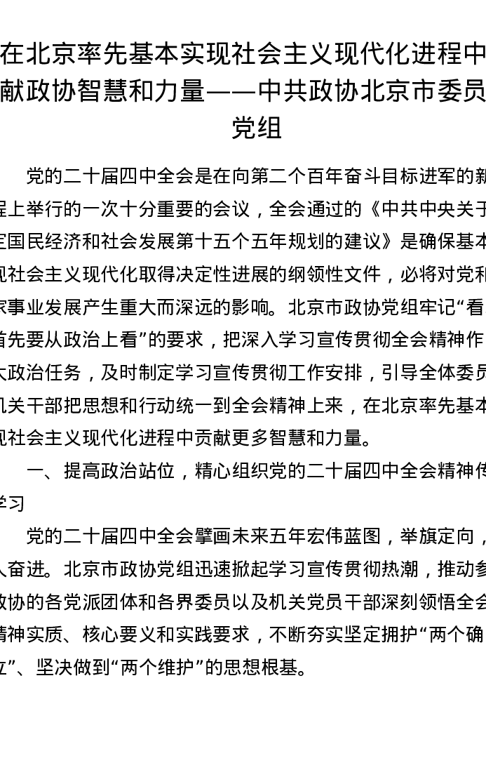 在北京率先基本实现社会主义现代化进程中贡献政协智慧和力量——中共政协北京市委员会党组