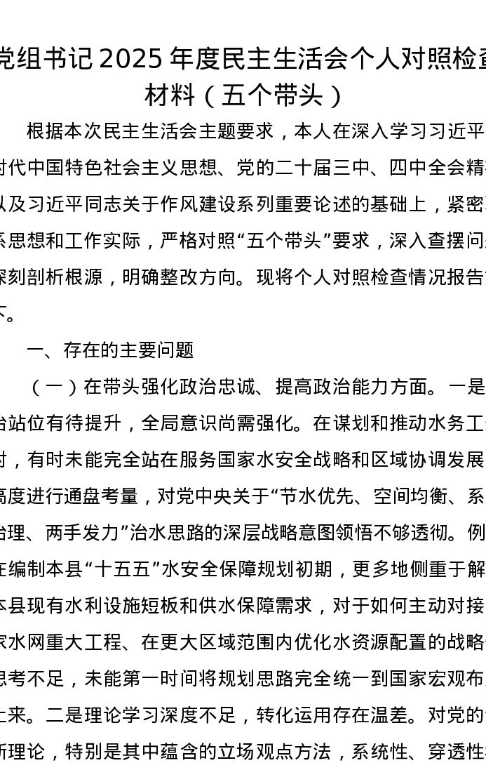 党组书记2025年度xxxxx个人对照检查材料(五个带头)