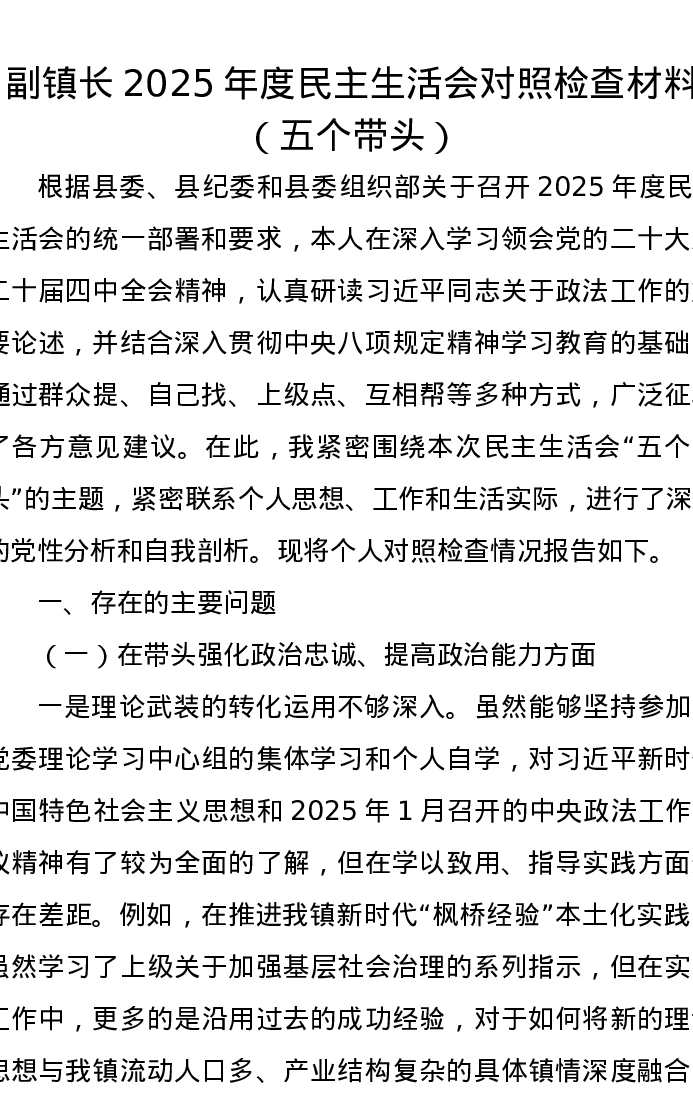 副镇长2025年度xxxxx对照检查材料(五个带头)