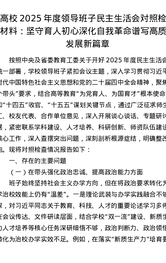 高校2025年度领导班子五个带头xxxxx对照检查材料:坚守育人初心 深化自我革命 谱写高质量发展新篇章