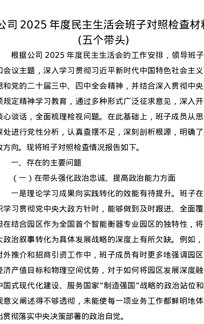公司2025年度xxxxx班子对照检查材料(五个带头)