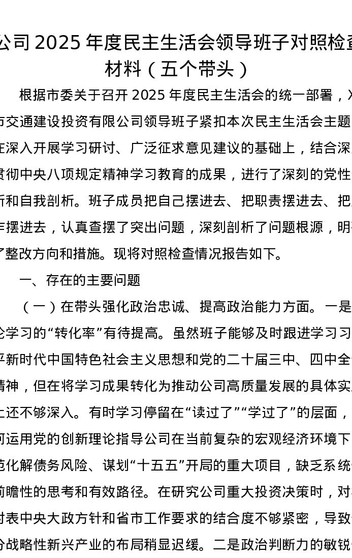 公司2025年度xxxxx领导班子对照检查材料(五个带头)