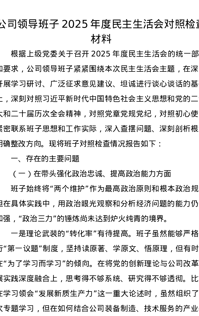 公司领导班子2025年度xxxxx对照检查材料(五个带头)