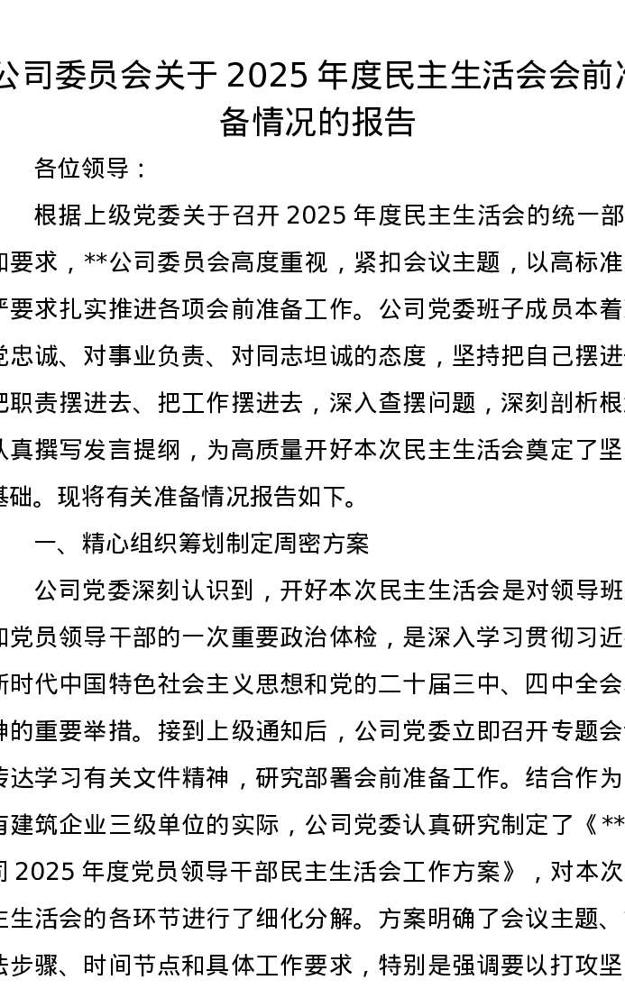 公司委员会关于2025年度xxxxx会前准备情况的报告(五个带头)