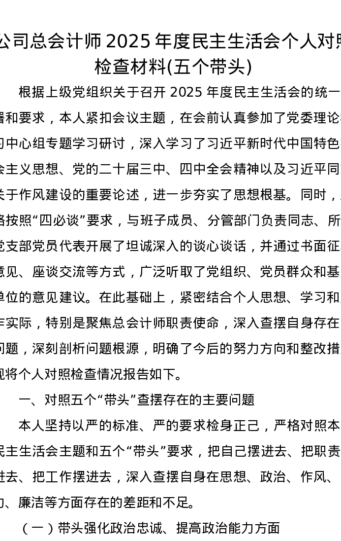 公司总会计师2025年度xxxxx个人对照检查材料(五个带头)