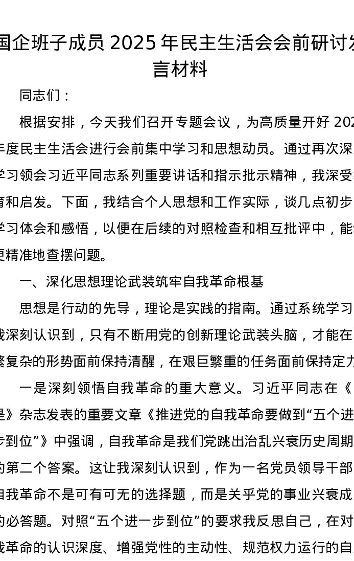 国企班子成员2025年xxxxx会前研讨发言材料(五个带头)