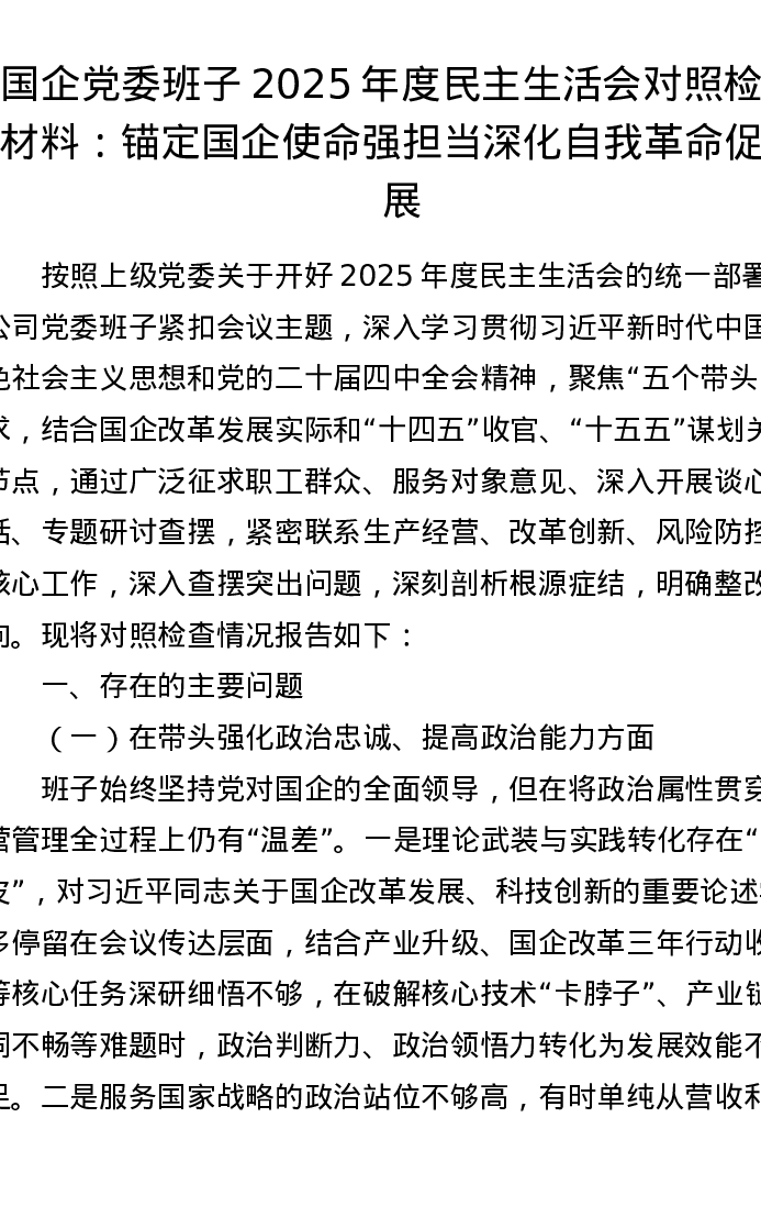 国企党委班子2025年度xxxxx对照检查材料:锚定国企使命强担当 深化自我革命促发展(五个带头)