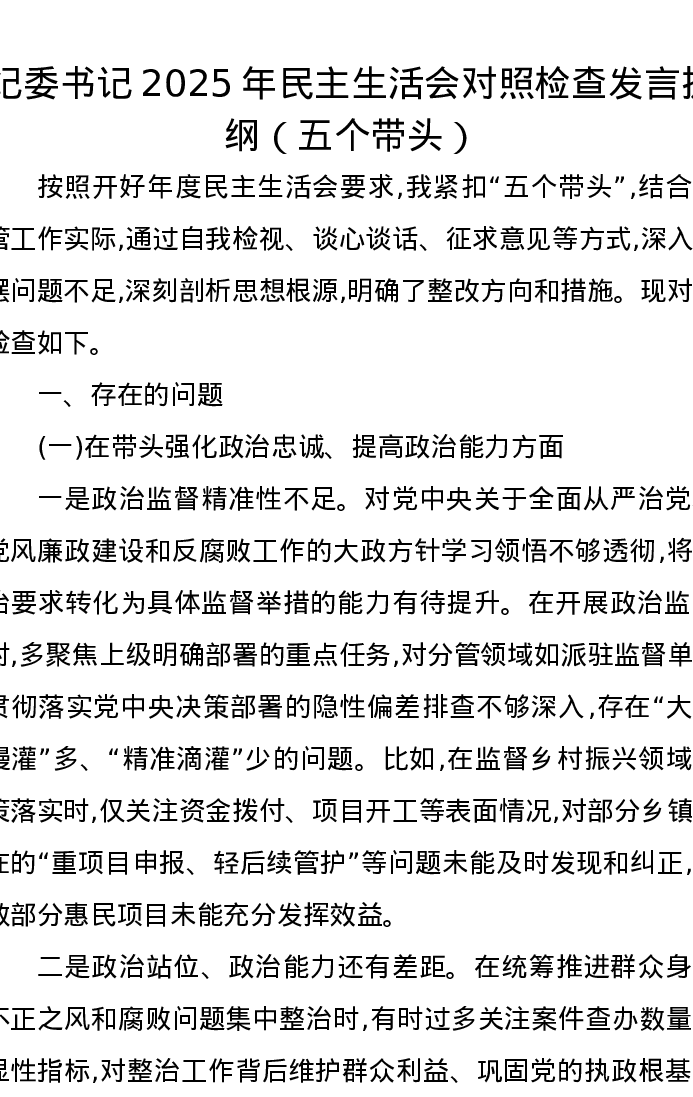 纪委书记2025年xxxxx对照检查发言提纲(五个带头)