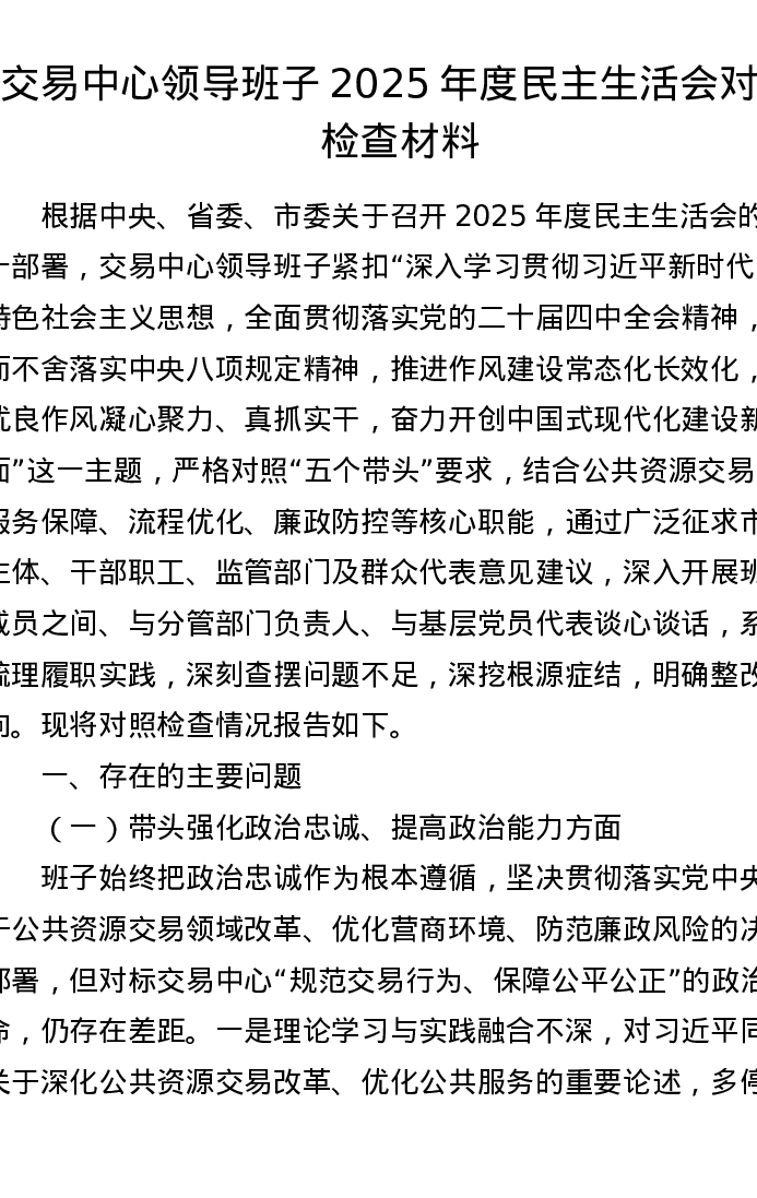 交易中心领导班子2025年度xxxxx对照检查材料(五个带头)