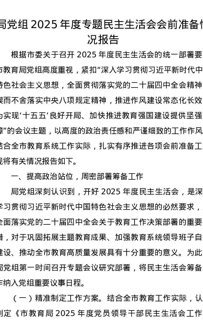 局党组2025年度专题xxxxx会前准备情况报告(五个带头)