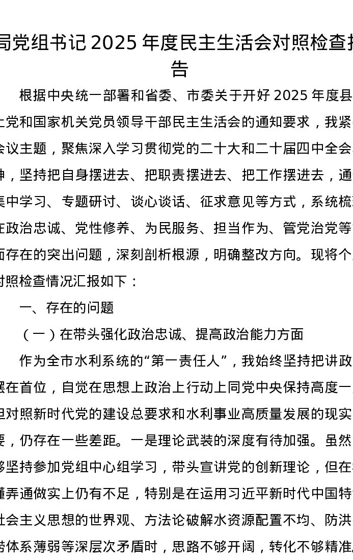 局党组书记2025年度xxxxx对照检查报告(五个带头)