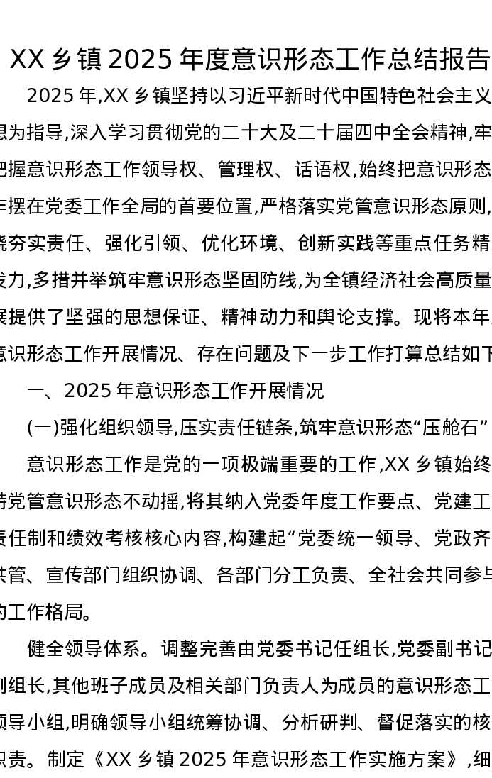 XX乡镇2025年度意识形态工作总结报告