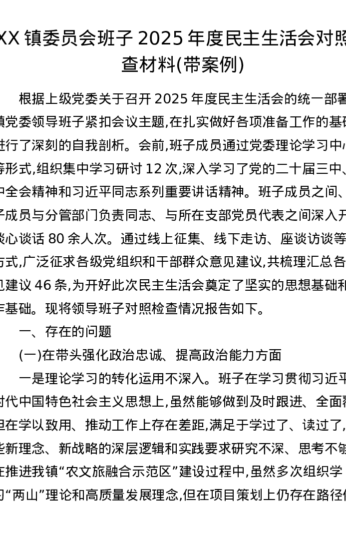 XX镇委员会班子2025年度民主生活会对照检查材料(带案例)