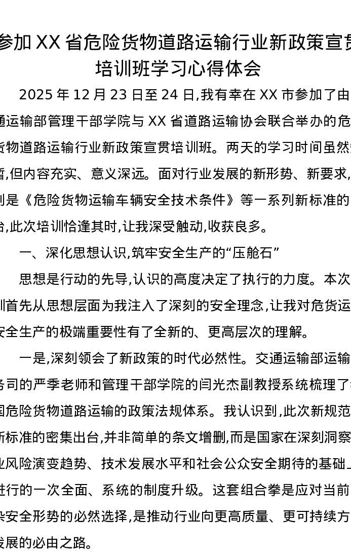 参加XX省危险货物道路运输行业新政策宣贯培训班学习心得体会