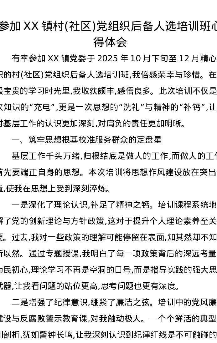 参加XX镇村(社区)党组织后备人选培训班心得体会