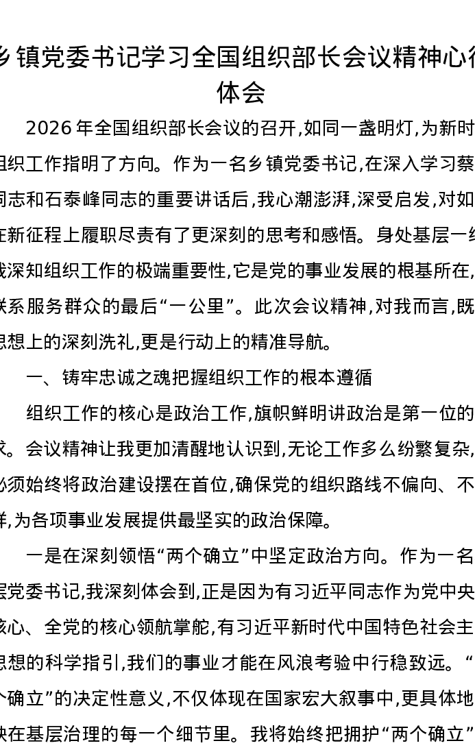 乡镇党委书记学习全国组织部长会议精神心得体会