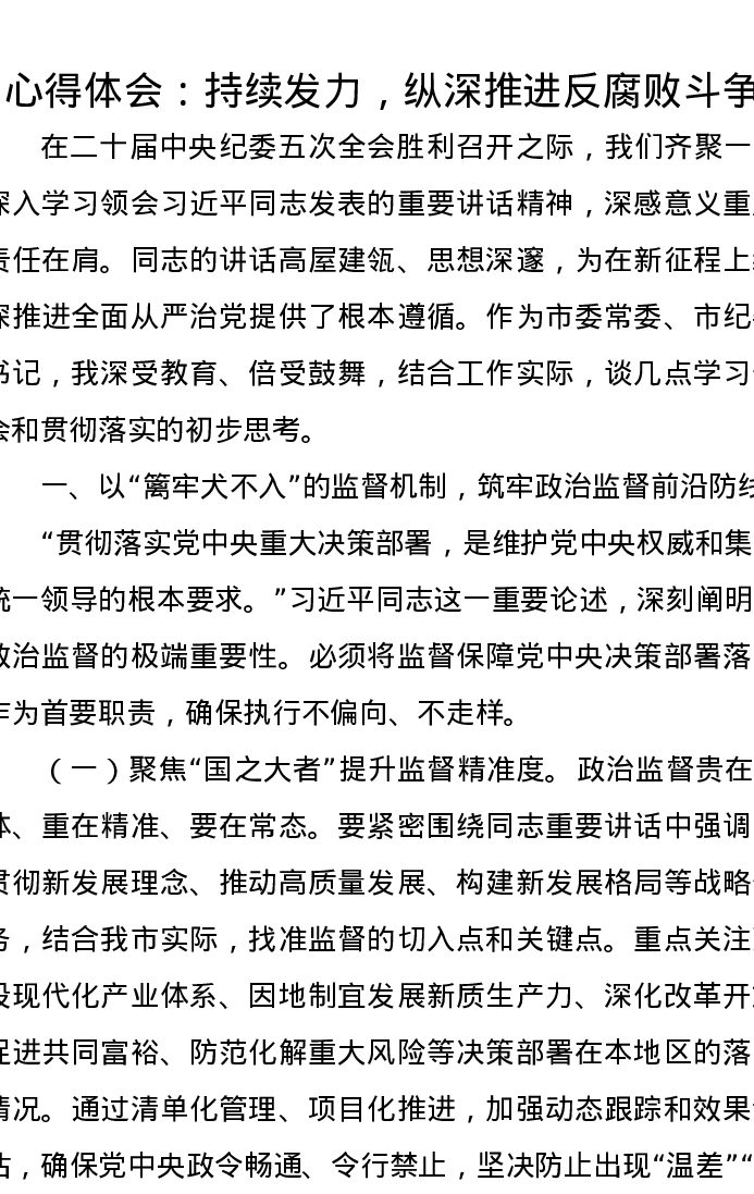 心得体会:持续发力,纵深推进反腐败斗争