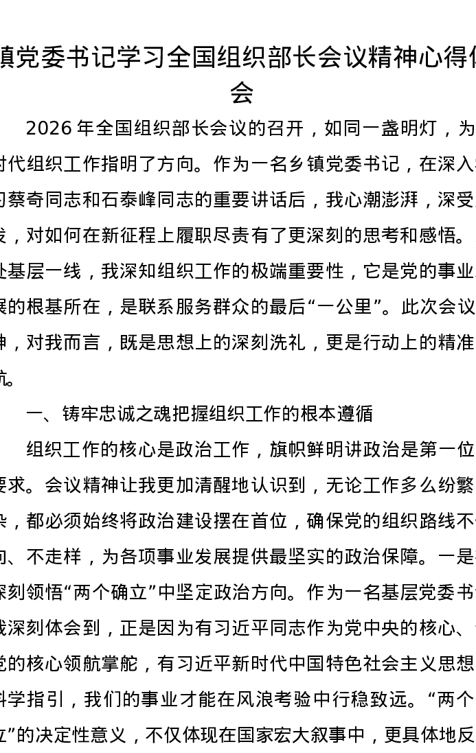 镇党委书记学习全国组织部长会议精神心得体会
