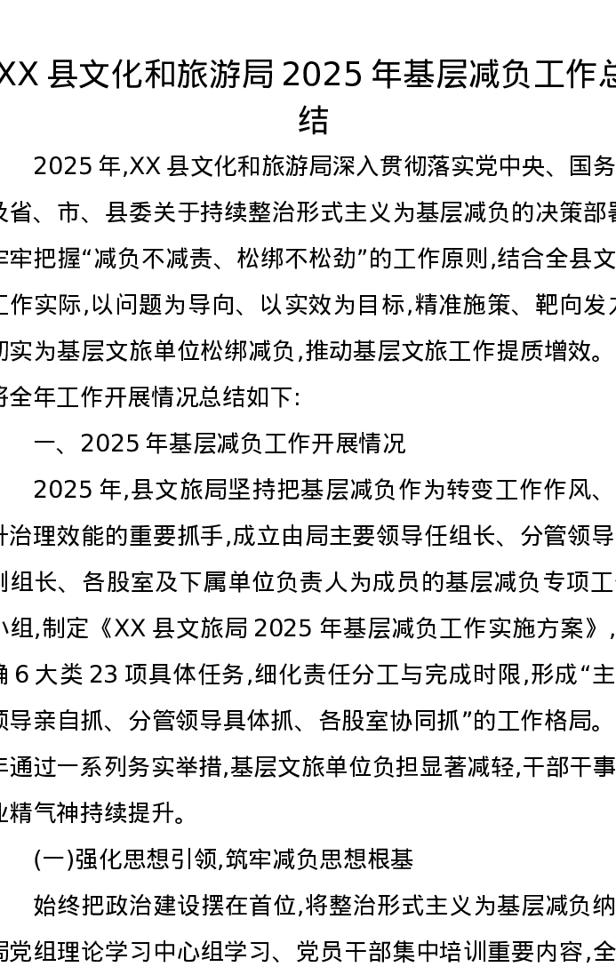 XX县文化和旅游局2025年基层减负工作总结