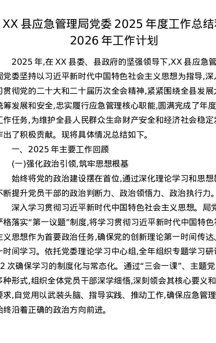 XX县应急管理局党委2025年度工作总结和2026年工作计划