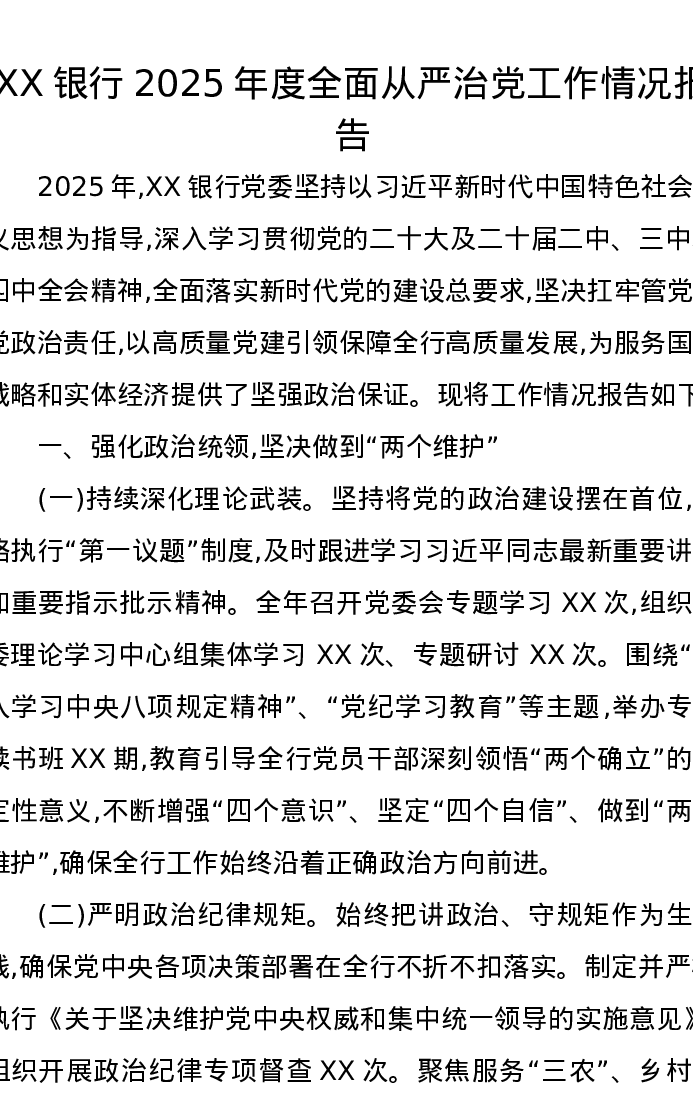 XX银行2025年度全面从严治党工作情况报告