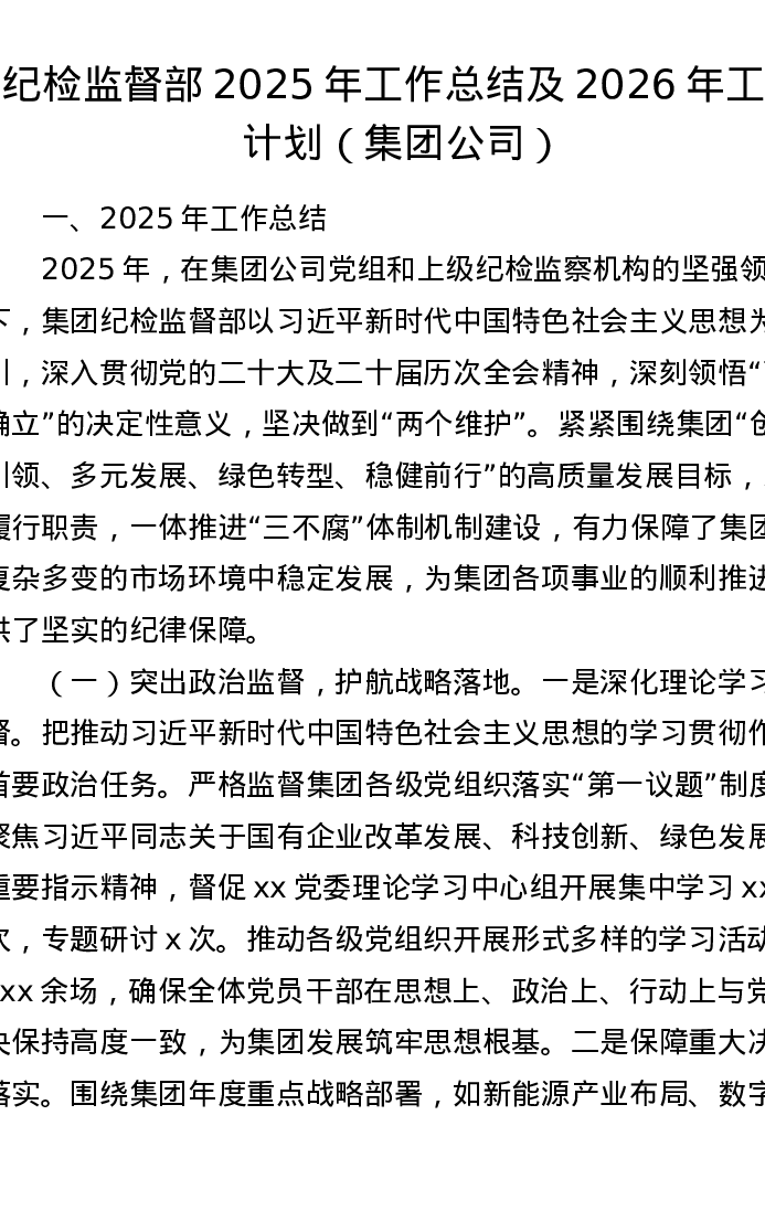 纪检监督部2025年工作总结及2026年工作计划(集团公司)
