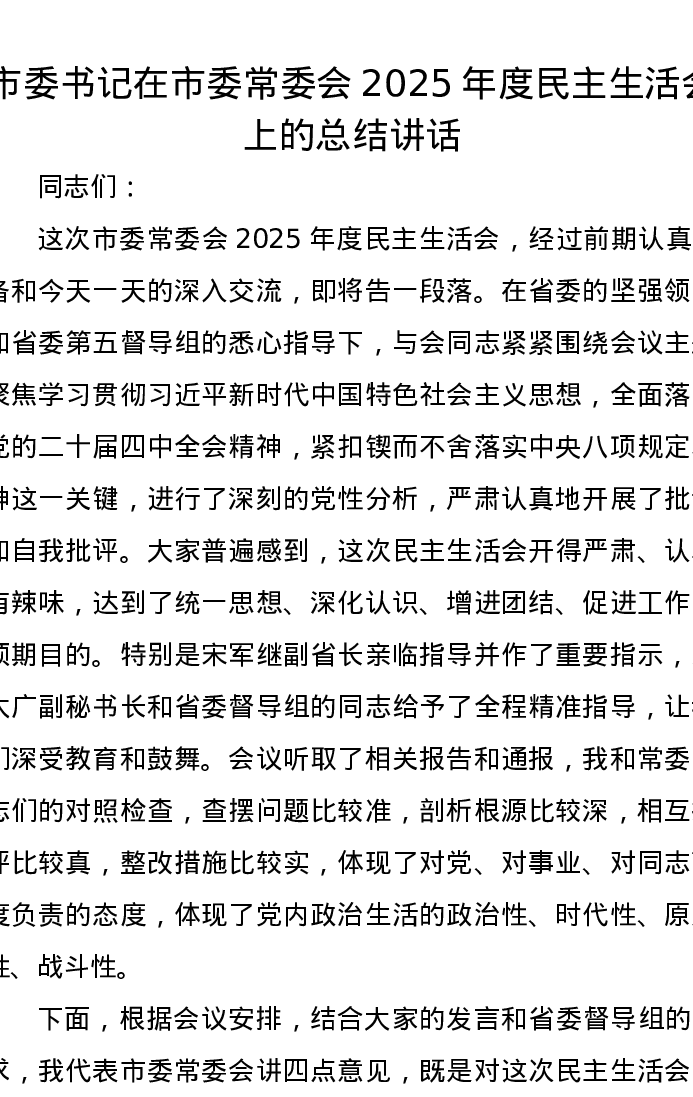 市委书记在市委常委会2025年度xxxxx上的总结讲话
