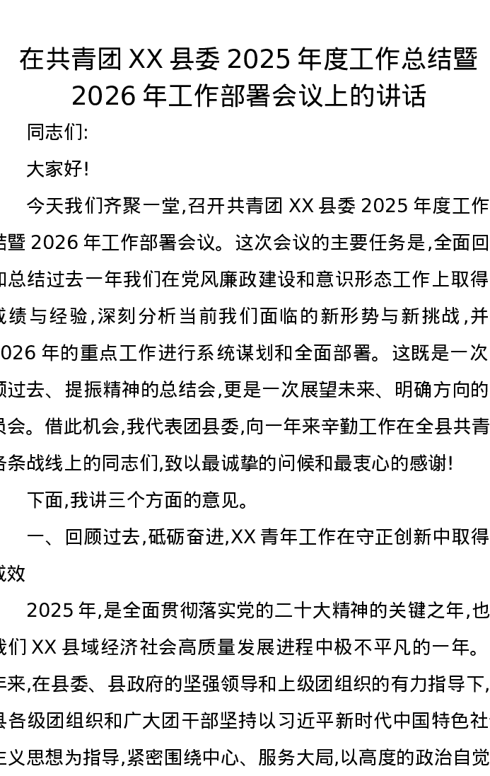 在共青团XX县委2025年度工作总结暨2026年工作部署会议上的讲话