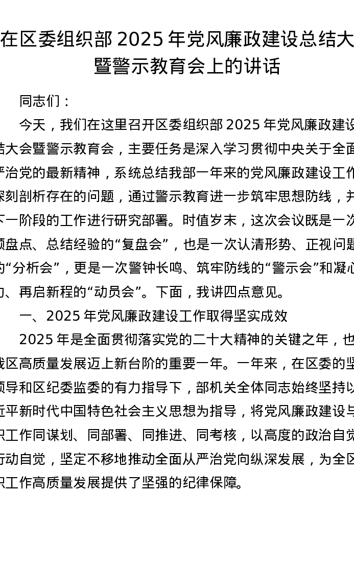 在区委组织部2025年党风廉政建设总结大会暨警示教育会上的讲话