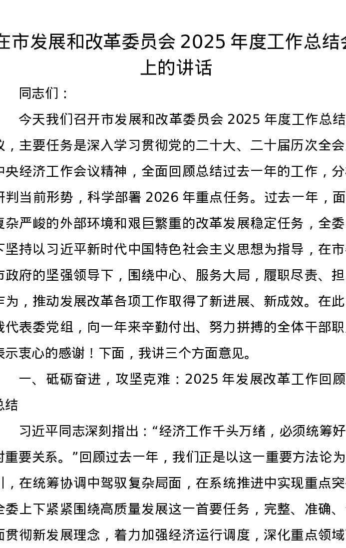 在市发展和改革委员会2025年度工作总结会上的讲话