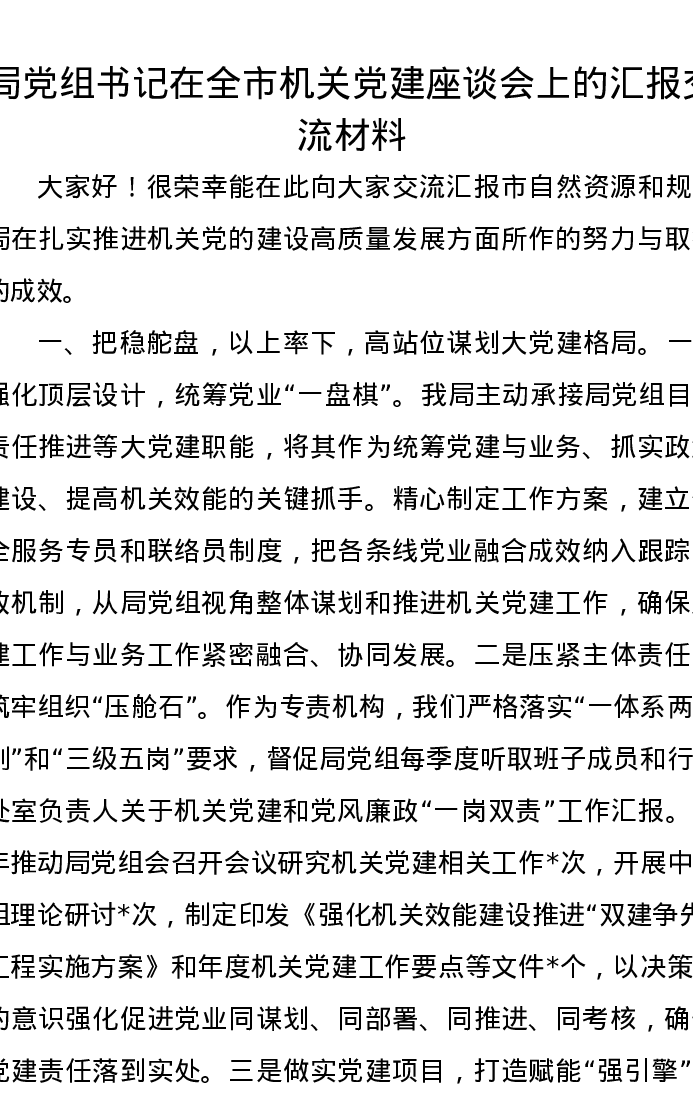 局党组书记在全市机关党建座谈会上的汇报交流材料