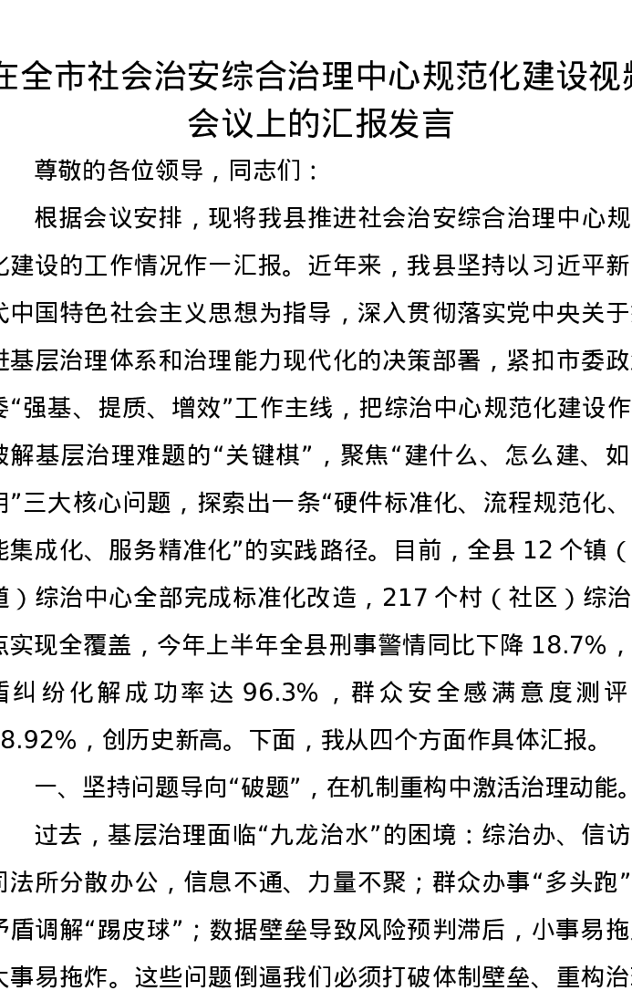 在全市社会治安综合治理中心规范化建设视频会议上的汇报发言