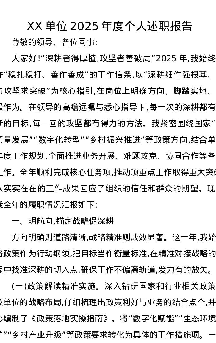 XX单位2025年度个人述职报告
