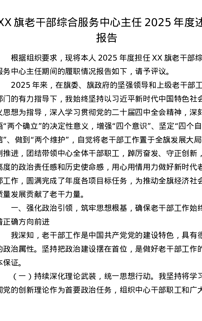 XX旗老干部综合服务中心主任2025年度述职报告