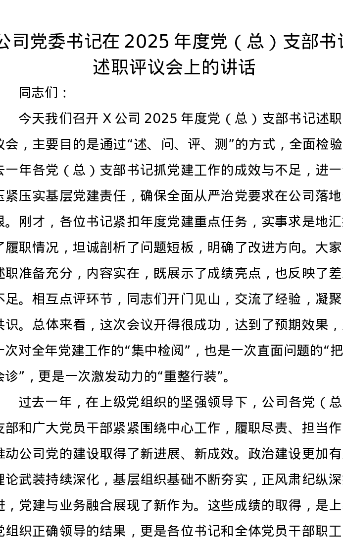公司党委书记在2025年度党(总)支部书记述职评议会上的讲话