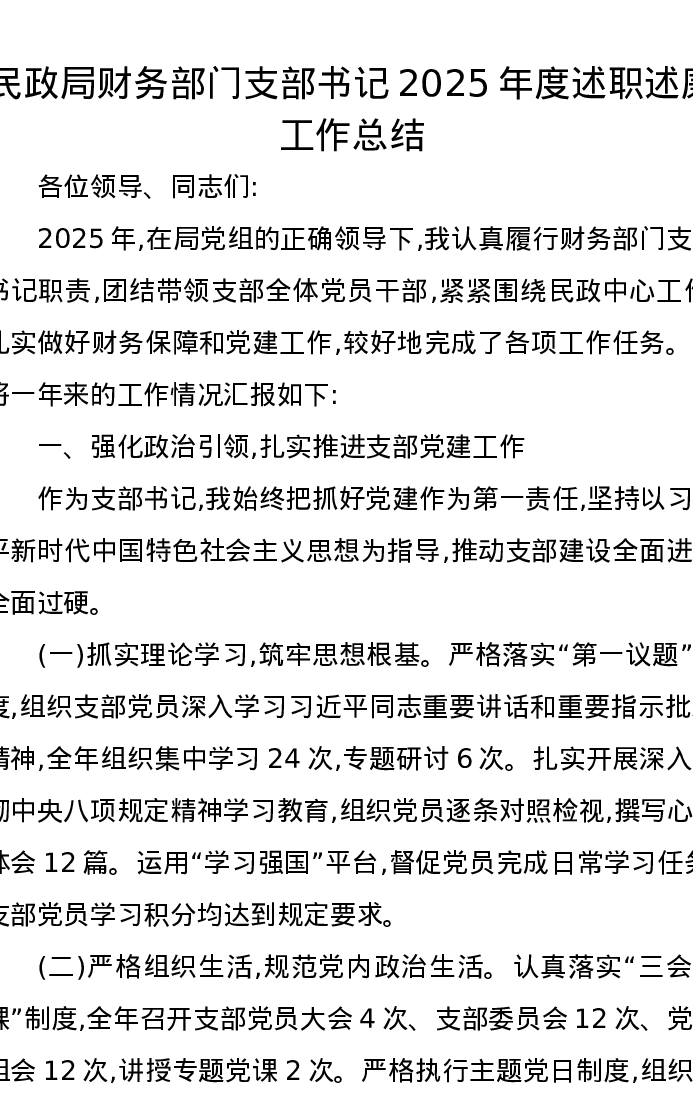 民政局财务部门支部书记2025年度述职述廉工作总结
