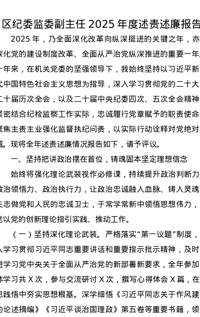 区纪委监委副主任2025年度述责述廉报告