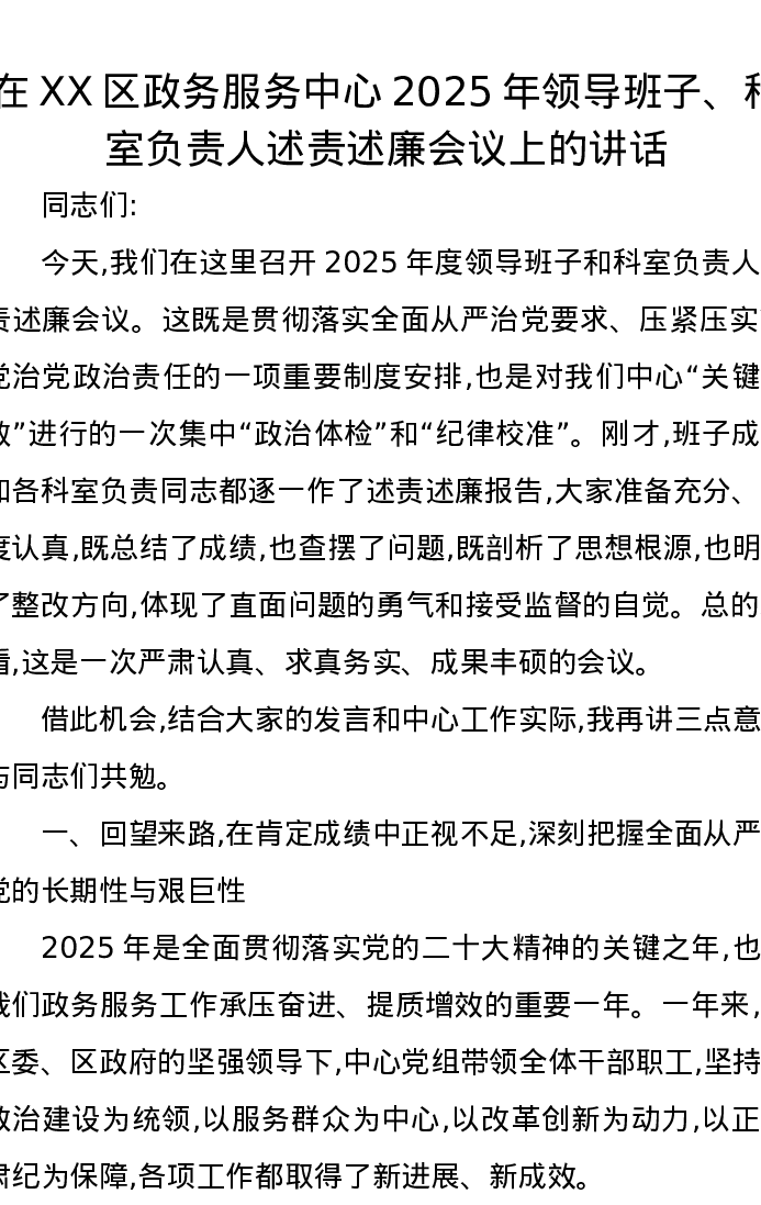 在XX区政务服务中心2025年领导班子、科室负责人述责述廉会议上的讲话