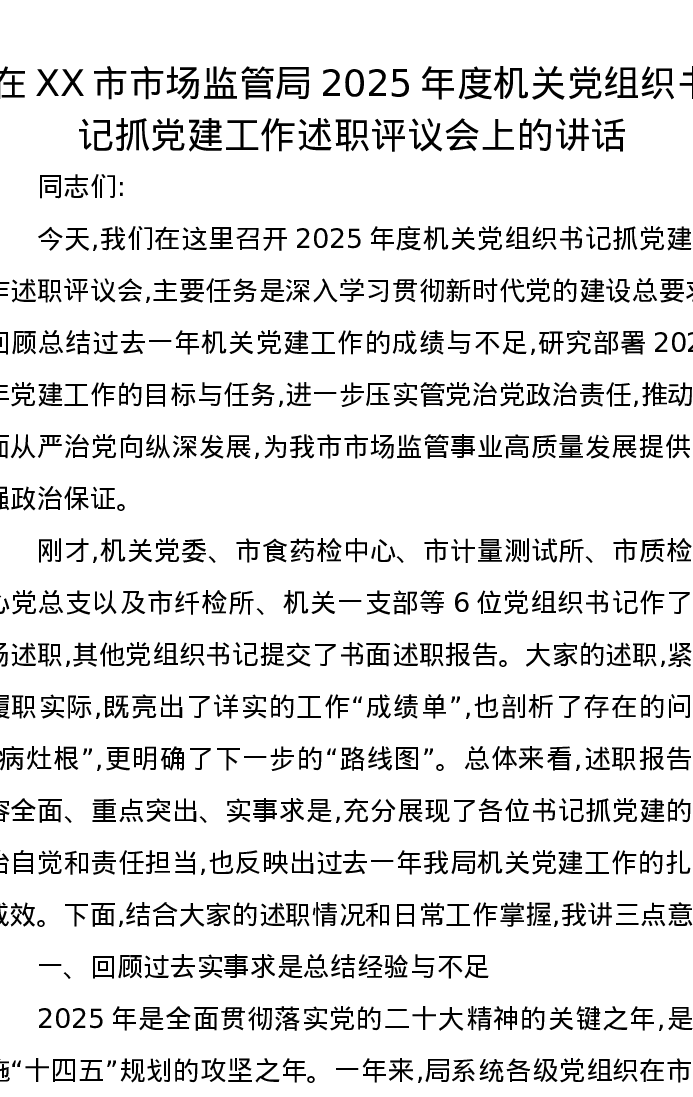 在XX市市场监管局2025年度机关党组织书记抓党建工作述职评议会上的讲话