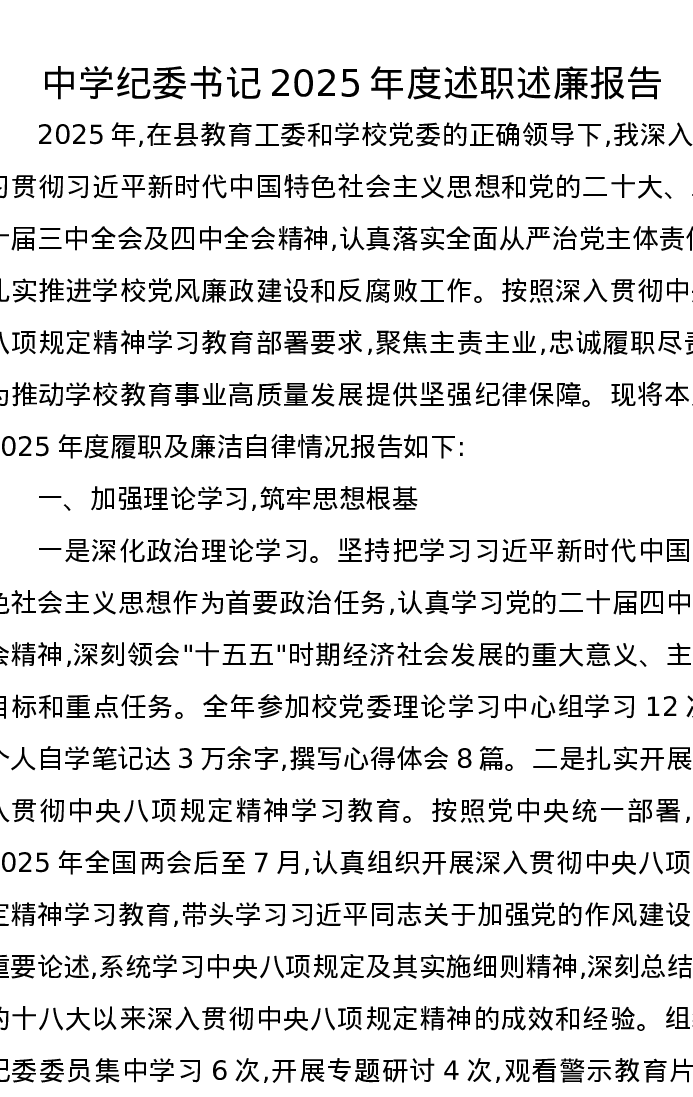 中学纪委书记2025年度述职述廉报告