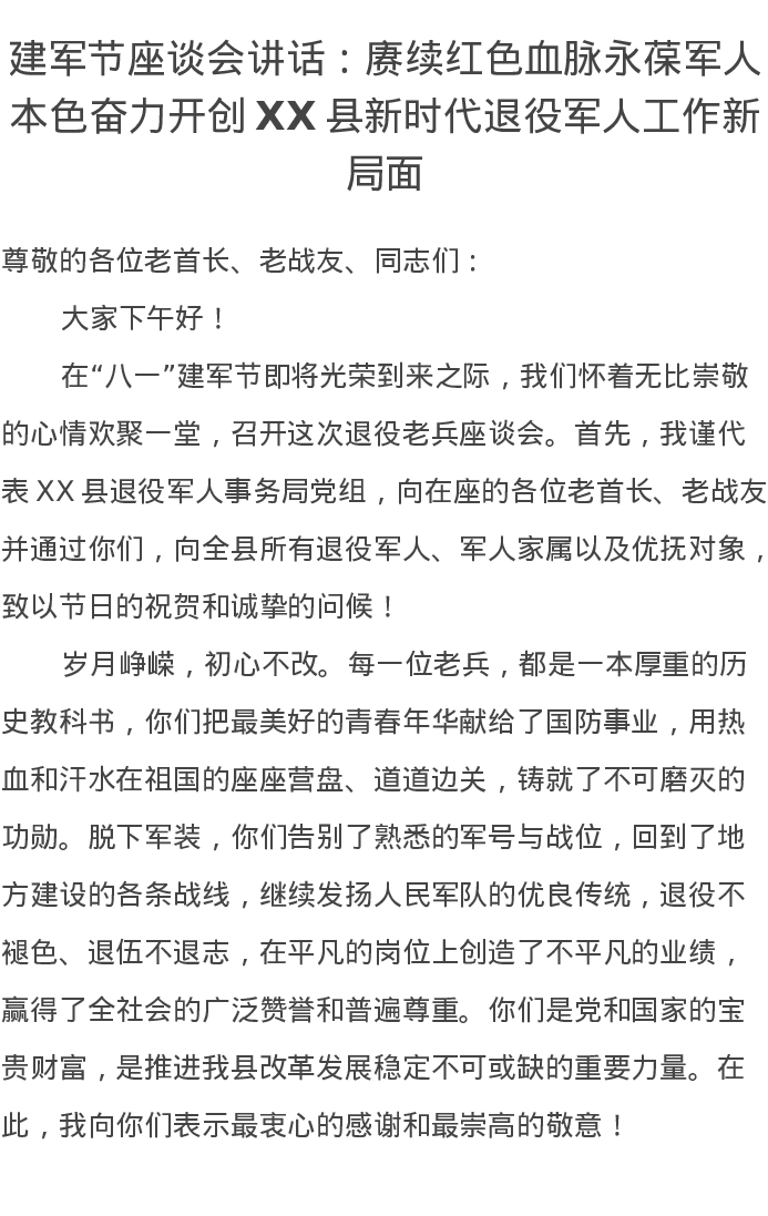 建军节座谈会讲话:赓续红色血脉永葆军人本色奋力开创XX县新时代退役军人工作新局面