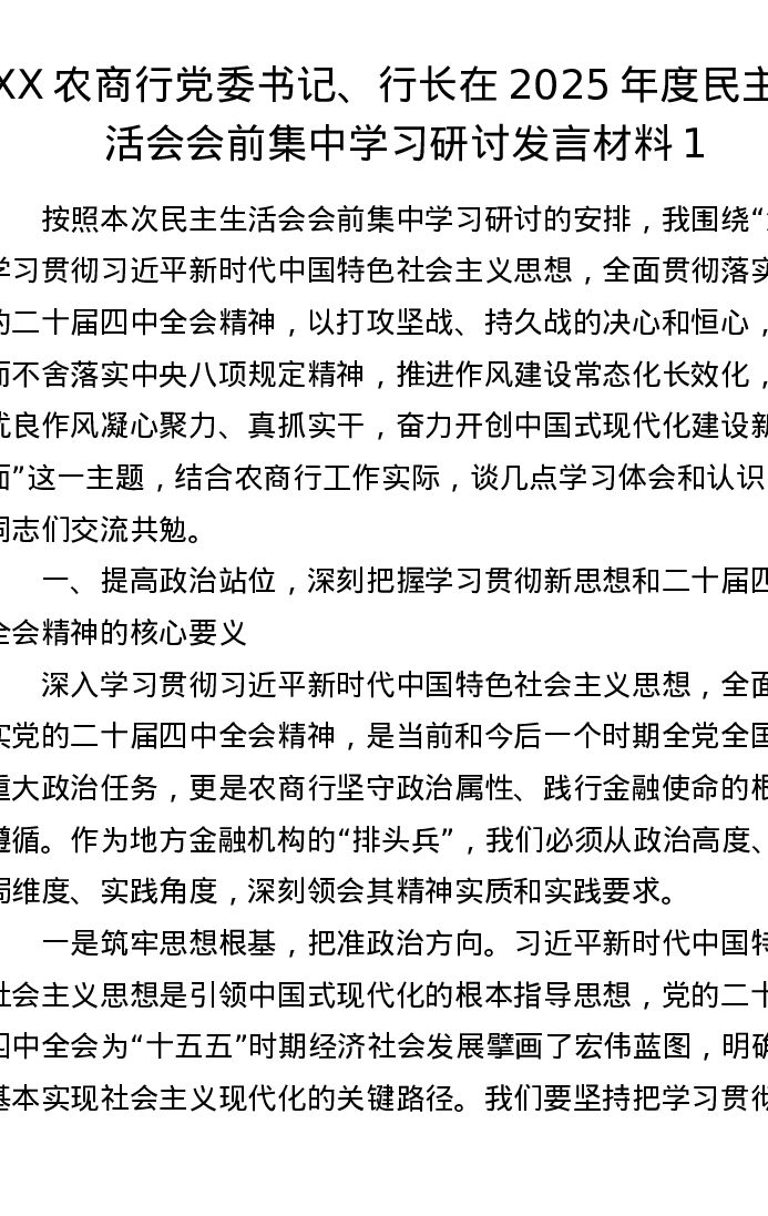 XX农商行党委书记、行长在2025年度xxxxx会前集中学习研讨发言材料1