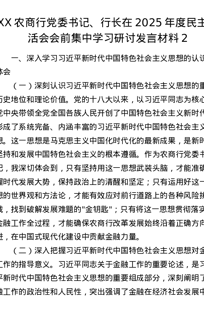 XX农商行党委书记、行长在2025年度xxxxx会前集中学习研讨发言材料2