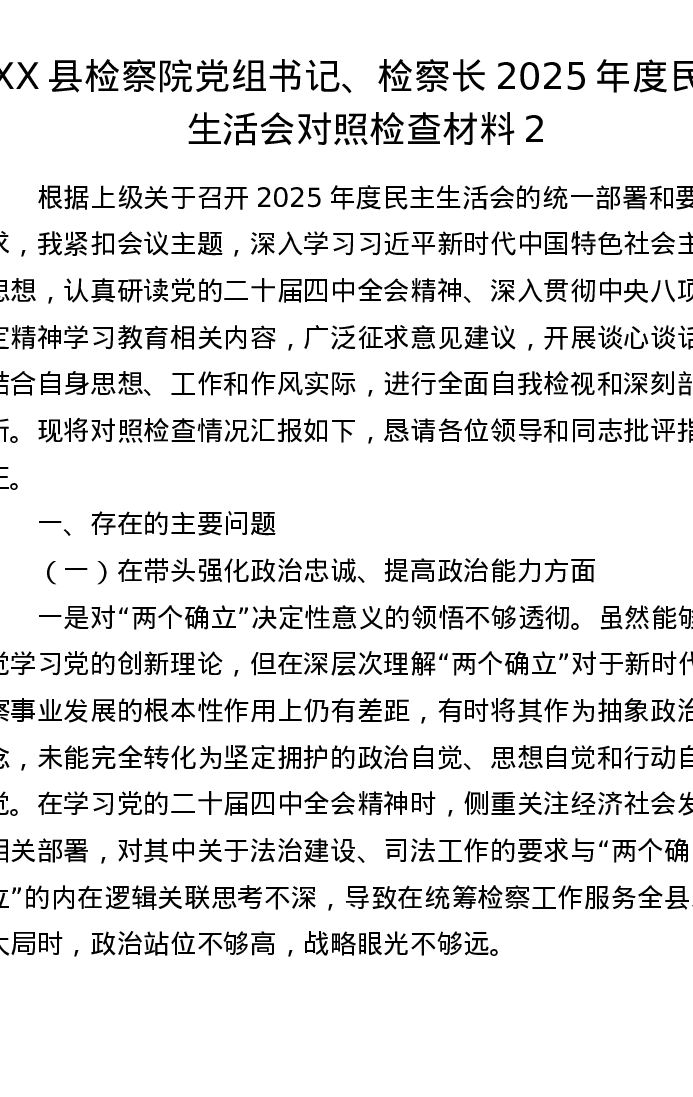 XX县检察院党组书记、检察长2025年度xxxxx对照检查材料2