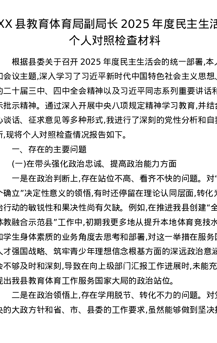 XX县教育体育局副局长2025年度xxxxx个人对照检查材料