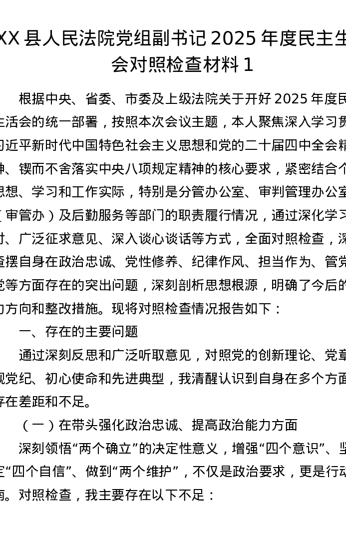 XX县人民法院党组副书记2025年度xxxxx对照检查材料1