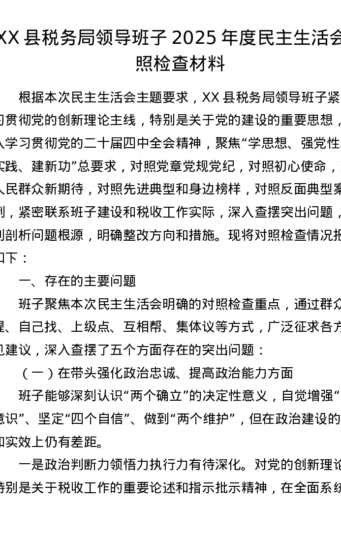 XX县税务局领导班子2025年度xxxxx对照检查材料